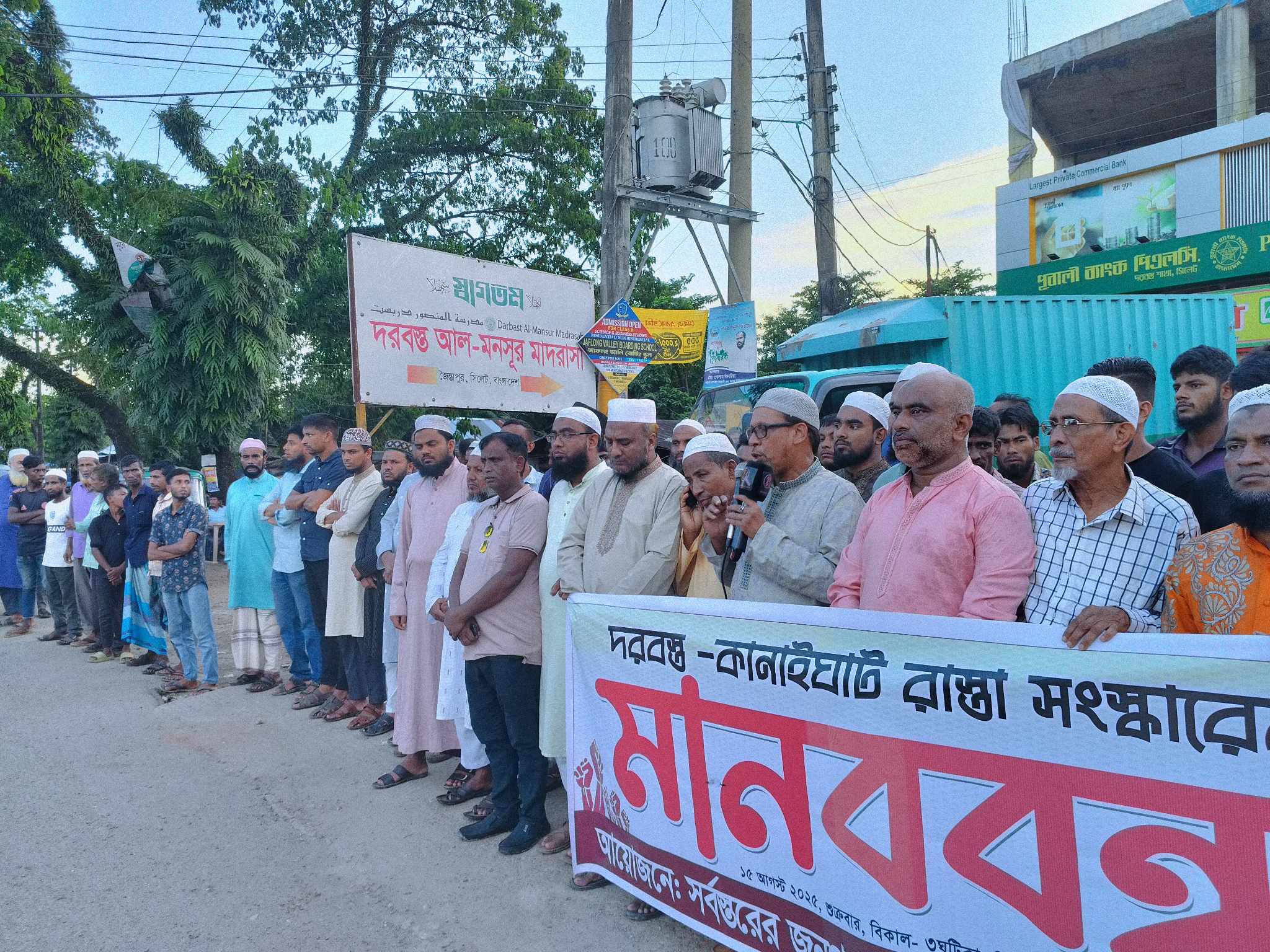 মানববন্ধনে প্রধান অতিথির বক্তব্য জেলা জামাতের সেক্রেটারি' সিলেট-৪ আসনের সংসদ সদস্য পদপ্রার্থী ও জৈন্তাপুর উপজেলা পরিষদের সাবেক চেয়ারম্যান জয়নাল আবেদিন বলেন, এ সড়কটি শুধু দরবস্ত নয়, কানাইঘাট ও জৈন্তাপুরের লাখো মানুষের দৈনন্দিন যাতায়াতের একমাত্র ভরসা। বছরের পর বছর অবহেলায় পড়ে থাকার কারণে রাস্তা চলাচলের অনুপযোগী হয়ে পড়েছে। রোগী পরিবহন, শিক্ষার্থীদের স্কুল-কলেজে যাতায়াত, কৃষিপণ্য বাজারজাতকরণ,সবক্ষেত্রেই মানুষ আজ সীমাহীন দুর্ভোগে পড়েছে। আমি প্রতিশ্রুতি দিচ্ছি, এ সড়ক সংস্কারের বিষয়টি আমি সংশ্লিষ্ট দপ্তরে জোরালোভাবে তুলে ধরব এবং জনগণের আন্দোলনের সঙ্গে সর্বাত্মকভাবে থাকব। শীঘ্রই এই সড়কটি সংস্কার না হলে আমার দুই উপজেলাবাসীকে নিয়ে বৃহত্তর আন্দোলনের ডাক দিব।