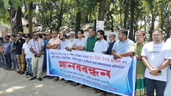 তাহিরপুর উপজেলা স্বাস্থ্য কর্মকর্তাকে অপসারণের দাবিতে মানববন্ধন
