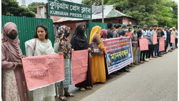 শাহজাহান খন্দকার, কুড়িগ্রাম প্রতিনিধি: ঢাকার সাভারে নির্মমভাবে হত্যাকাণ্ডের শিকার কুড়িগ্রামের শিক্ষার্থী সারুফ রানা রাসেলের হত্যার প্রতিবাদে মানববন্ধন অনুষ্ঠিত হয়েছে। আসামীদের দ্রুত গ্রেফতার ও দৃষ্টান্তমূলক বিচারের দাবিতে বুধবার (৬ আগস্ট)